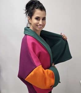 Jedna strona w głębokiej butelkowej zieleni, druga w energetycznym zestawieniu kolorów: fuksja, śliwka i pomarańcz. Kurtkę można nosić na dwa sposoby, dopasowując ją do stylizacji i nastroju.